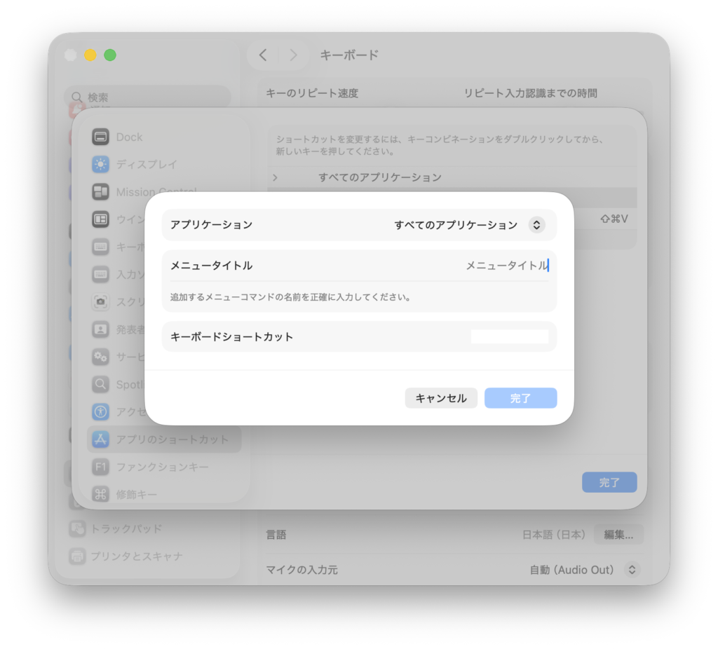 システム設定 → キーボード → キーボードショートカット → アプリのショートカット